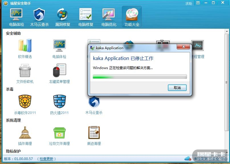 请楼主提供您的瑞星安全助手版本号,查看瑞星安全助手目录下是否有后缀为DMP格式的文件,如有请压缩后跟帖上传。在停止响应时如果可以截图,请提供截图。