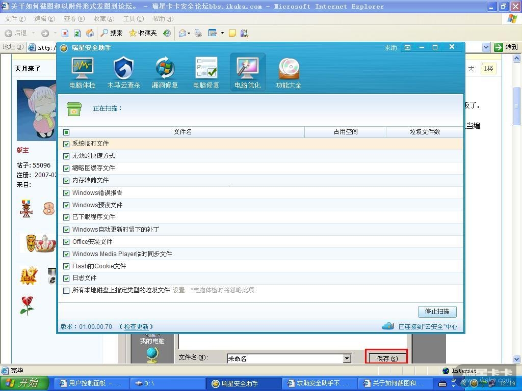 我是windowsxp盗版用户是hp原装台机,瑞星安全助手扫描垃圾时没有边上的绿进度条且始终不扫描但我停止扫描键时反应很快,如在扫描时我关闭助手,他就提示扫描在进行问我是否停止,其实他根本就不在扫。本人菜鸟一只不会截图