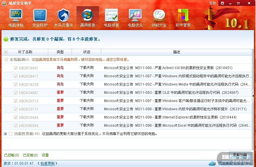 回复: !!!求助,我的瑞星安全助手无法下载漏洞。