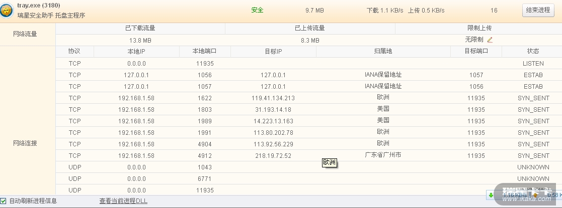 另外,本人看了自己的联网程序,关于瑞星的Rsleak.exe、tray.exe等正在实时运行的软件,在我关闭IE及其它软件的情况下,其归属地,在不到1秒的时间就不停地变换,不是美国就是欧洲,要不就是在中国的不同省份的不同城市不停地变换,详见下面几幅图片,另外,本人关闭了瑞星系列软件后,IE上网正常,速度飞快!!!请瑞星工程师给个解释啊。