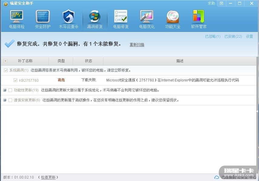 请楼主上传瑞星安全助手提示KB2757760补丁下载失败的截图看看,截图上传方法请参考: