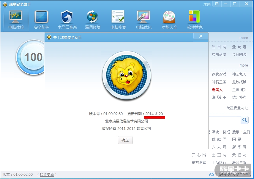 用安全助手体检完毕时,查看“关于”,发现有一处设置不是很合理的地方,建议把它修改成【2014-03-21】而不是现在使用的这个样子。