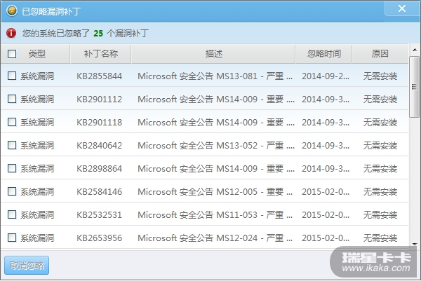 前段时间卡卡更新后漏洞扫描将12年的老漏洞都显示出来了(之前版本检测无漏洞),可是用windows update检查并无漏洞,点击卡卡漏洞更新后重启,显示已忽略,无需安装!这是怎么回事?软件bug吗?