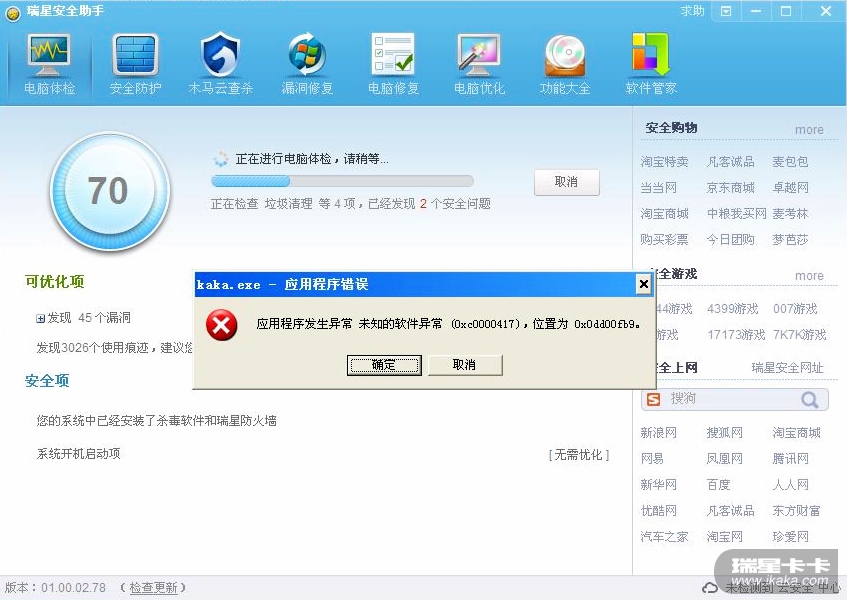 1、请查看瑞星安全助手安装目录下是否有kaka.exe的dmp文件,如果有,请压缩跟帖发来;