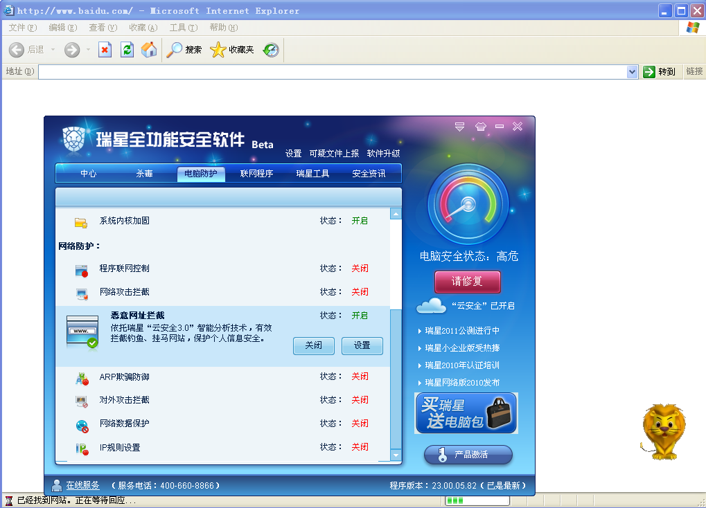[疑似bug] 无法上网?原因找到!一旦打开瑞星全功能2011的恶意网址拦截,便无法上网!