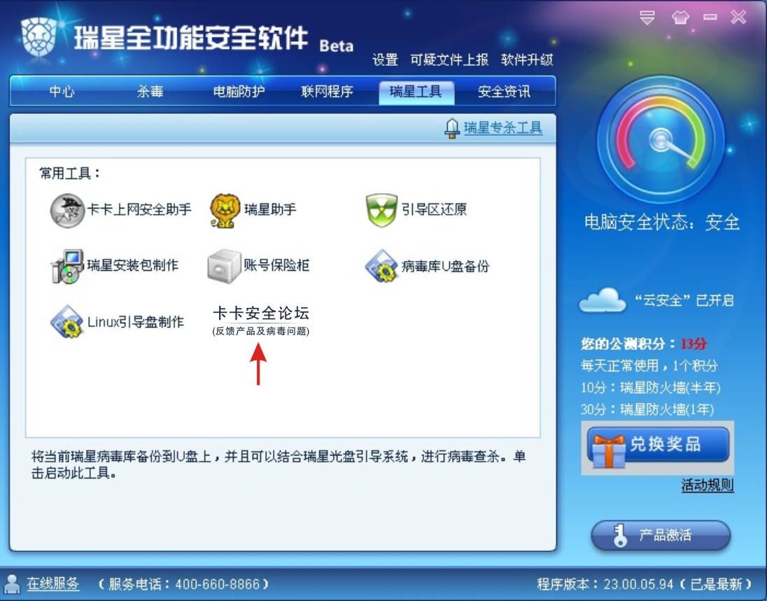 希望在“瑞星工具”中增加个“卡卡安全论坛”的图标,给用户增加一种遇到问题时的处理的方式,