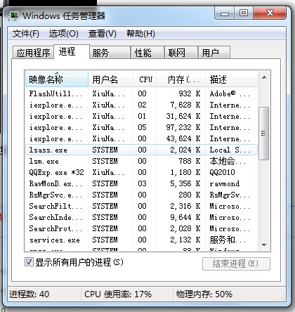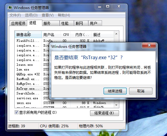 可以看出,RIS2011 Beta在Windows 7 64下没有安装目录的自我保护。下面,就开始测试进程保护。首先打开任务管理器,转到进程选项卡,尝试结束RavMonD.exe。