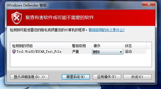 下载eicar防病毒测试文件,结果Windows Defender报警了,RIS2011毫无反应。
