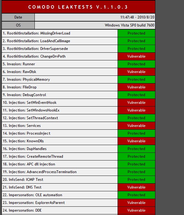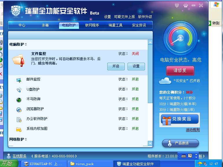 我从瑞星安装目录随便找到一个文件,直接把它右键删除,结果很杯具,确实文件被删除了。没有自我保护效果。