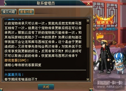 GM大神,我上次说的,我宠物库玛西只有一次传承的那件事,在宠物资质传承更新前,我的龙和库玛西相互传承了一次,导致我的库玛西现在只有一次传承,现在我的库玛西资质已满(这两天120级刚进化又没有满了,不过没多久又要满),害的我连奥兹什么的都不敢养,现在战虎也快出来了,我到时就不能全部传承给战虎了,能否恢复我的库玛西两次传承?传给龙的那次资质你们可以清空甚至全部把龙的资质清空或者把那龙卖了我都没意见,这些资质都是金币堆起来的啊!心疼啊!主要是我做出相互传承这个坑爹的决定,是在宠物资质传承更新前,我以为系统就是这样设定的,哪知道后面更新后我就悲剧了,这不怪我吧,如果我是在宠物资质传承更新后做出的相互传承我也就没话说,只能怪我自己手痒。所以我很早前就向GM请求过,但是一直没有给我恢复。要不更新的话,大家都不能进行二次传承,我也没什么意见,这样大家都在一个起跑线,我也没什么损失,但是我因为以前系统的设定,更新就造成没有机会享受二次传承的好处,导致我落后其他玩家一大截,我估计我战虎出来,我库玛西至少也有6800的平均资质,只能传承一次就少每项少3400资质,生命大概少2500资质,就少13700左右资质,这差距就拉的就不是一般的大了!而且这个传承现在被传承宠物不能超过传承宠物资质,开放三次传承甚至无限传承也不影响平衡问题。只要给传承机会,项圈用荣誉或金币都不是问题。 所以特再次请求调取我的游戏记录,并恢复我库玛西二次传承或者给予第三次传承的机会,本人不胜感激啊。