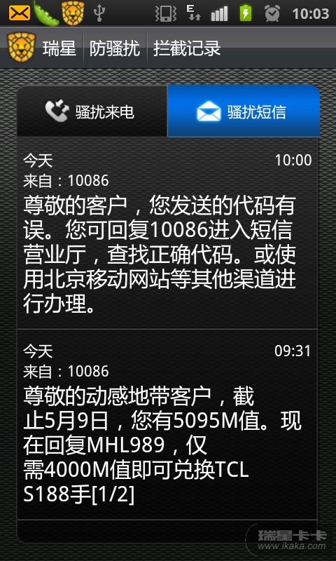 问题现象: 正常骚扰短信被QQ安全助手拦截了,10086的短信被瑞星拦截了一半