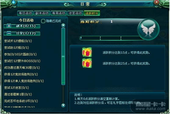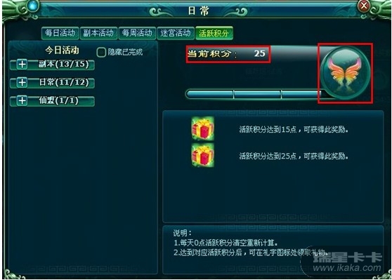 今日活动内容会随着玩家等级的提升而慢慢增多,此时玩家所能获得的总积分也会随着增多。当玩家达到一定的积分后,右边翅膀图标也会随着改变,更加多姿多彩。更高的积分还能获得更高级的积分礼包奖励哦。