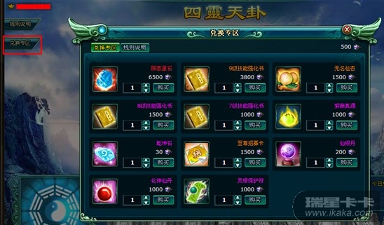 四、奖励兑换气运值可在兑换专区兑换珍贵道具,如陨落星石、无名仙杏和9级技能强化书等,兑换物品为绑定。