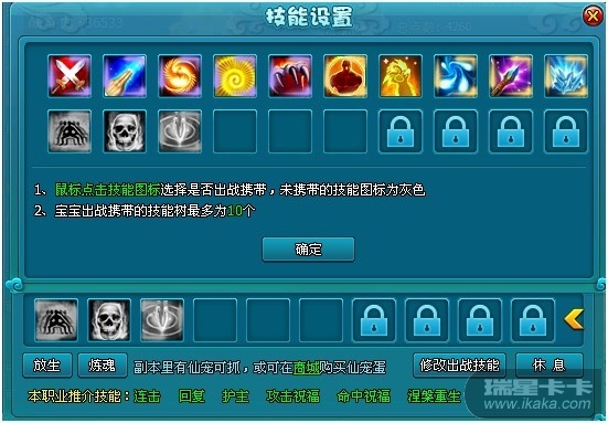 个技能栏,所有技能任你学!战斗中,选择自己想要的仙宠技能出战即可!