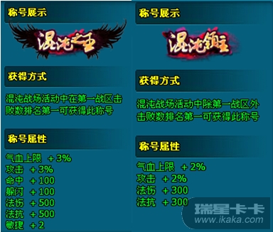 混沌战场活动中第一战区击败数排名第一可获得“混沌之王”称号;在除第一战区外的其他战区击败数排名第一可获得“混沌领主”称号。