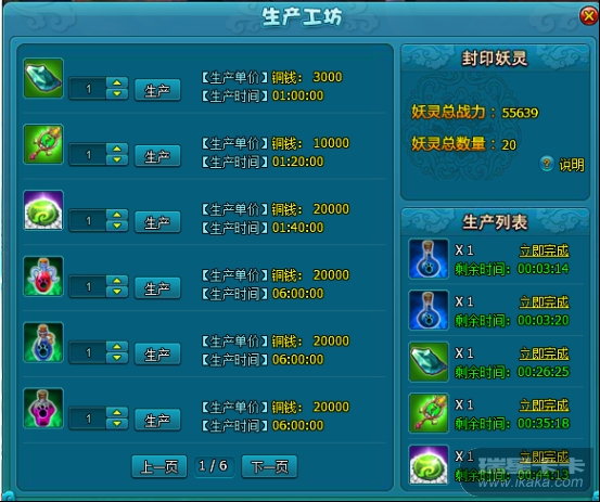 生产工坊点击生产工坊,即可打开生产面板。消耗相应的铜币与时间即可生产道具,消耗的时间与已激活的所有妖灵战力相关,战力越高,生产时间就越短。