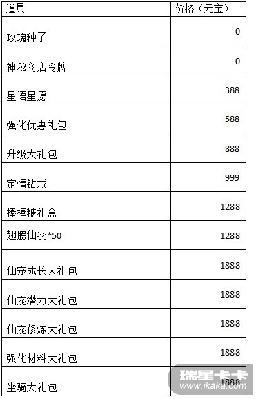 打开【玫瑰礼包】•紫可获得鲜花99朵*1、仙宠成长丹*1、护神丹*1、气血包*1,打开【玫瑰礼包】•蓝可获得幸运石*1、仙宠成长丹*1。