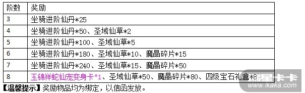 活动期间,将坐骑进阶至指定阶数,可获得额外系统赠礼。