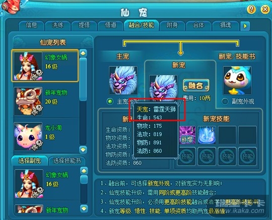 )在日光浴界面上提示日光浴多倍经验道具【仙露琼浆】和【玉露琼浆】的使用方法,新手玩家再也不用担心不懂日光浴啦。3、仙宠融合界面优化优化仙宠融合界面,鼠标悬浮信息增加宠物名称的显示,不用再担心操作错误。