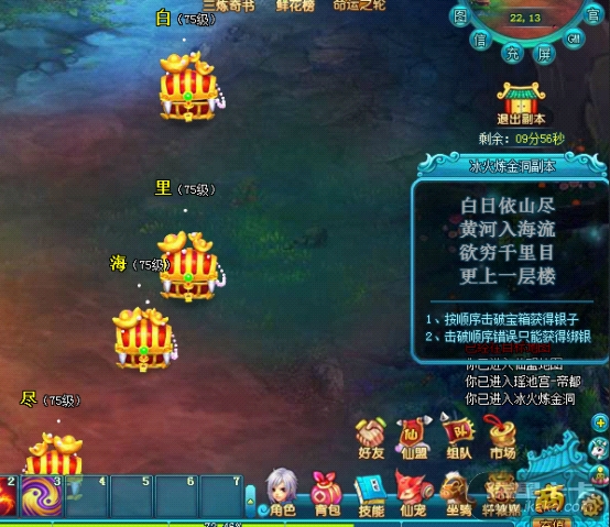 、调整冰火炼金洞炼狱难度为了防止外挂软件对普通玩家造成的恶劣影响,也为了让玩家在游戏过程中能够寓教于乐,游戏更新冰火炼金洞炼狱难度的打钱模式,玩家必须根据古诗顺序,依次击破相应的宝箱,才可获得不绑定银子。