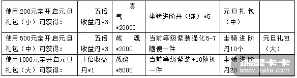 五倍收益丹*1、真气*20000、坐骑进阶丹(绑)*5、元旦礼包(小)*1
