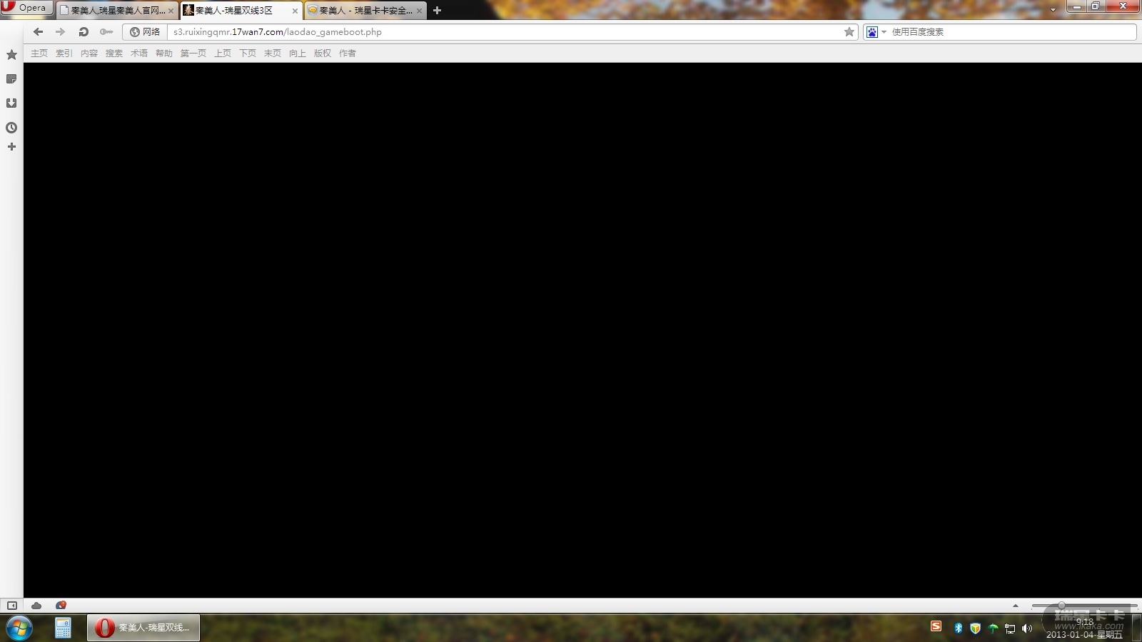 我于2013年1月4日登录《秦美人》,登陆界面正常。点击“进入X区”的按钮后就出现一个黑屏的界面。换个浏览器还是如此。附截图。