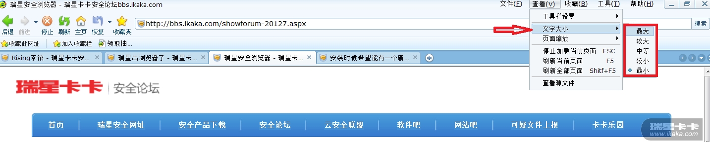 点击标题拦“查看”、“文字大小”; 无论点击那档,显示的文字大小均无变化。