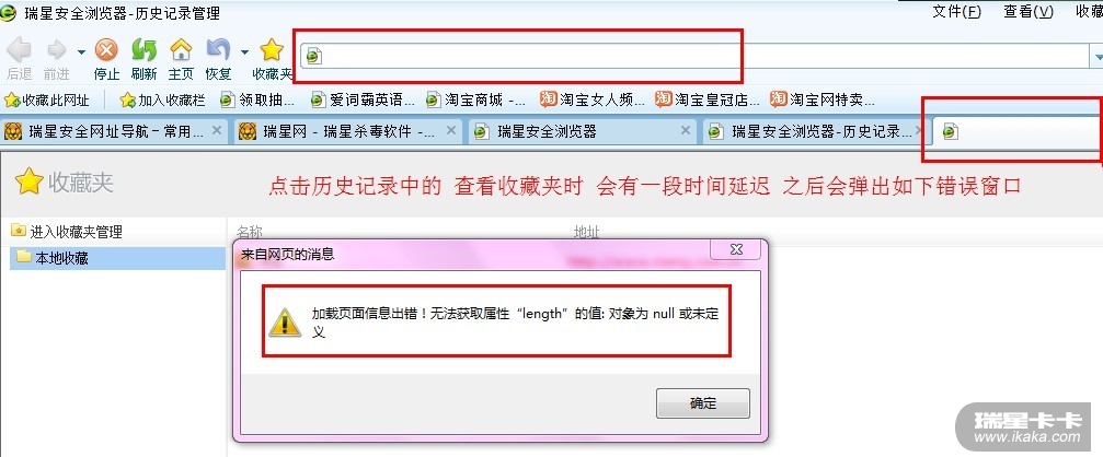 问题现象:打开浏览历史 点击 收藏夹查看 弹出错误窗口 如下附图