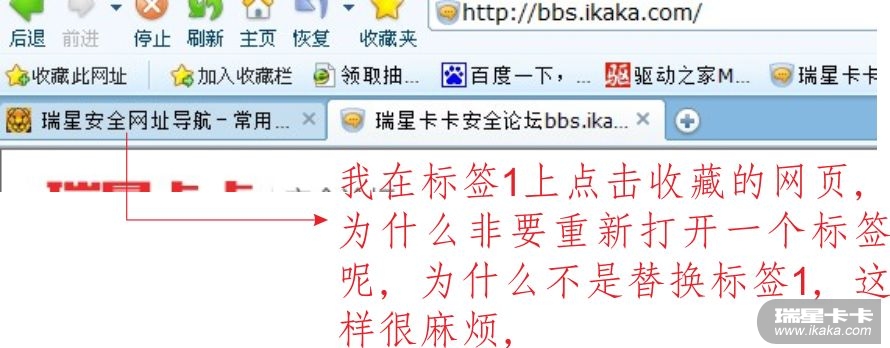操作步骤:我用瑞星浏览器时,在标签1上点击收藏夹里的网址时,此时会打开一个新的标签,这样是不是不对啊,应该是替换了标签1的内容