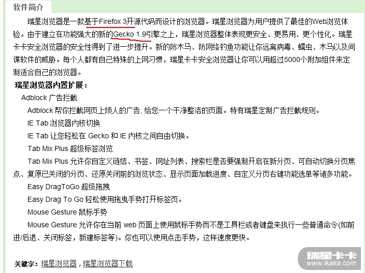 我可以告诉你,你看到的可能是以前瑞星开发的安全浏览器介绍,当时使用的就是火狐内核,后来软件没有更新了。现在的使用什么内核不太清楚,我查查在告诉你。