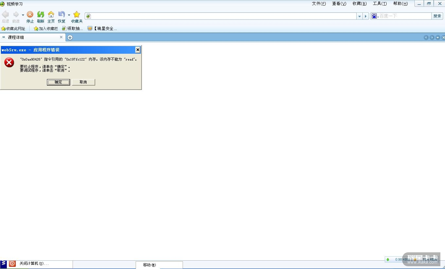 瑞星浏览器,在收听网络课程窗口在6个以上时,会完全没有反映,所有的页面都是空白的,且关闭后重新进入后,有时会弹出如下对话框