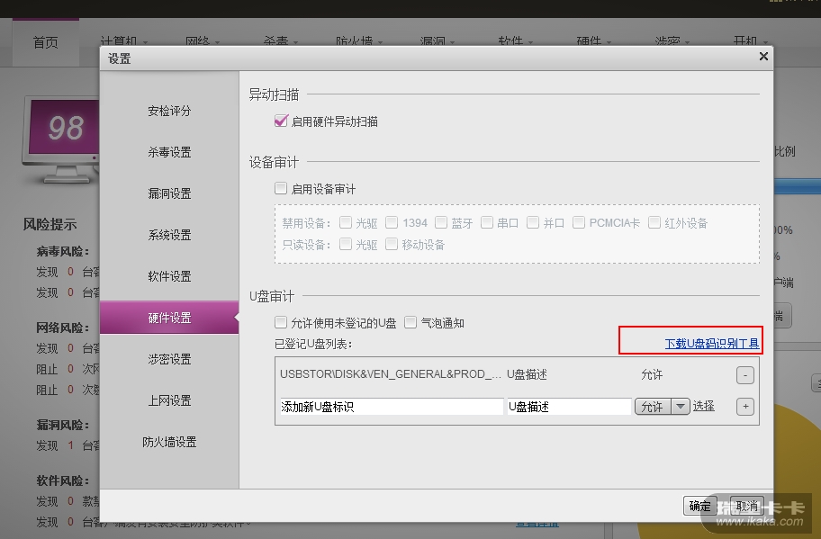审计管理控制台里面 ,硬件设置里有个下载u盘识别工具。