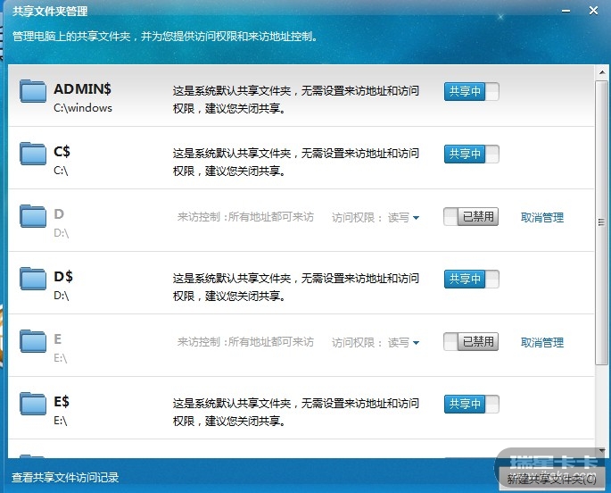 使用瑞星防火墙中的,实用工具,共享管理工具,关闭其中的默认共享c$、d$等后,重启系统后,这些被关闭的共享又再次打开了,