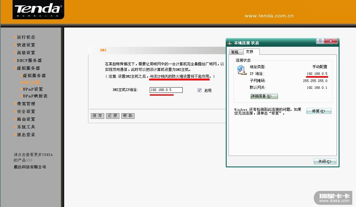 由于是内网,为了保证测试正常进行,我们把路由器的防网络攻击设置去掉,并且加上DMZ主机设置