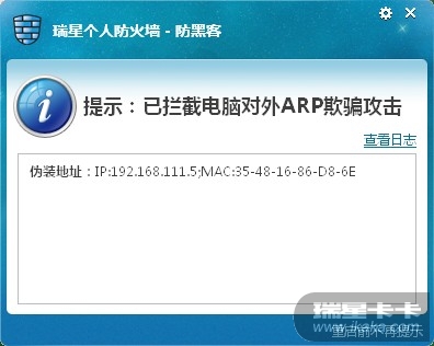 然后进行BanGateway攻击测试,结果,瑞星提示拦截对外ARP攻击!