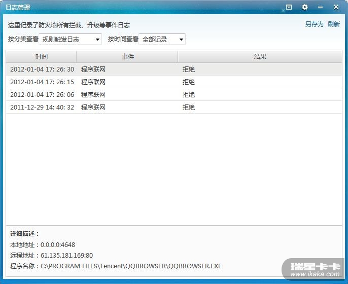 我设了程序联网控制拒绝QQ浏览器联网,触发拦截后,查看日志发现本地地址是0.0.0.0