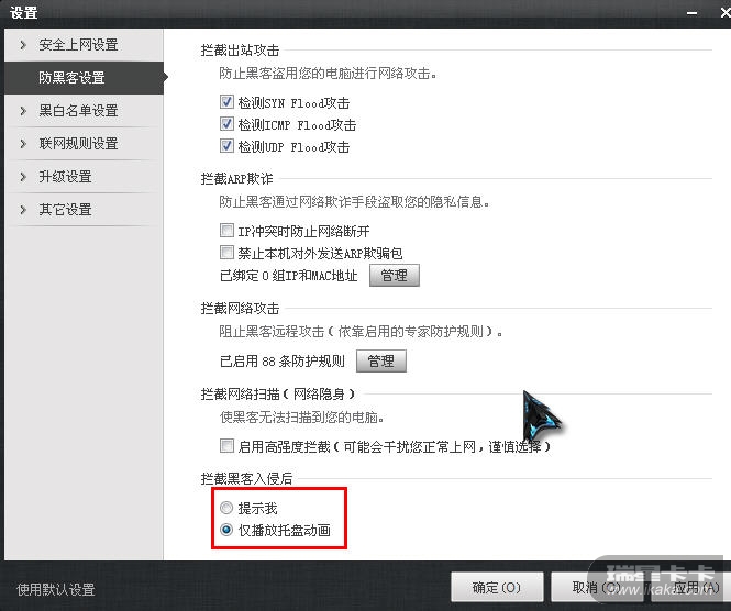 防火墙设置中三处报警方式,目前默认设置都是“提示我”