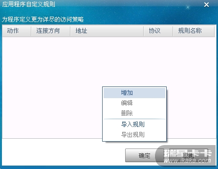 选择自定义后,双击“酷我音乐盒”,会弹出“应用程序访问规则设置”,点击“有0条自定义规则”,弹出“应用程序自定义规则”,右键单击空白处可以进行添加等设置。例如: