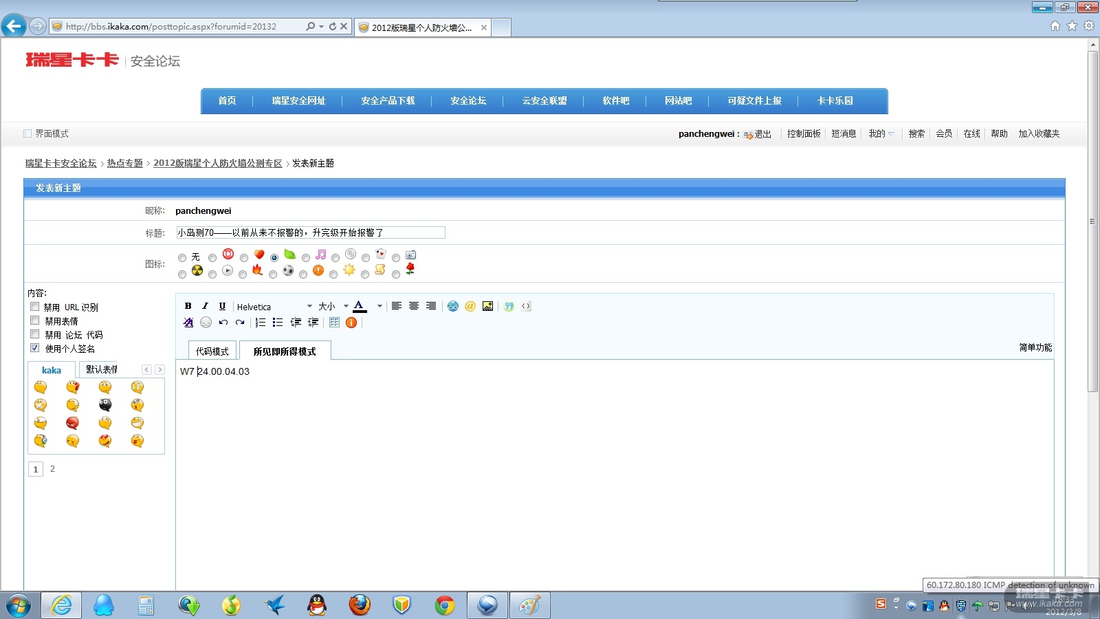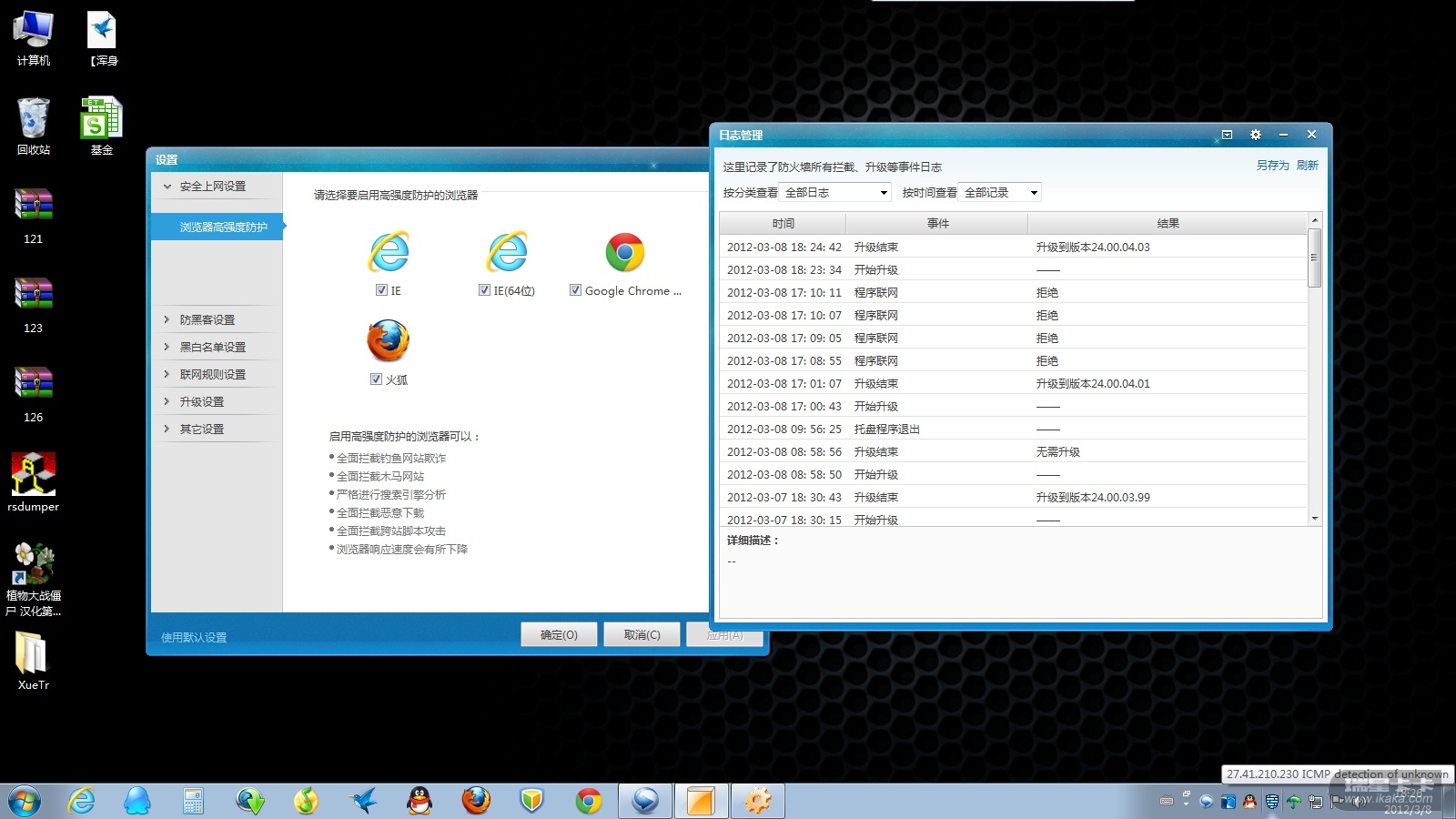 防火墙开始检测到威胁了,从我参加测试,从第一个测试版到今天为止,W7系统下我就没见过托盘报警,那红灯一闪一闪的,那不成以前就一直没有工作?