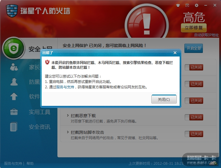 求助!!俺刚装的2012瑞星个人防火墙,所有防护都打不开