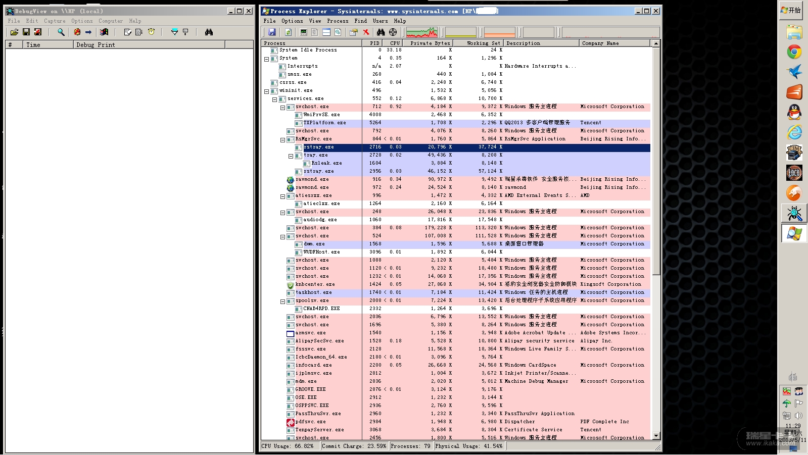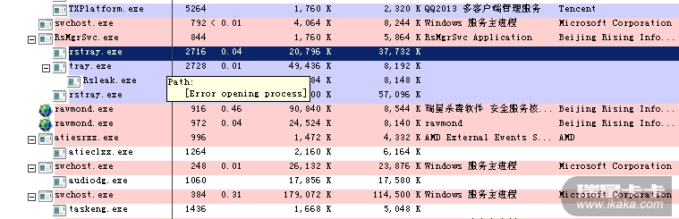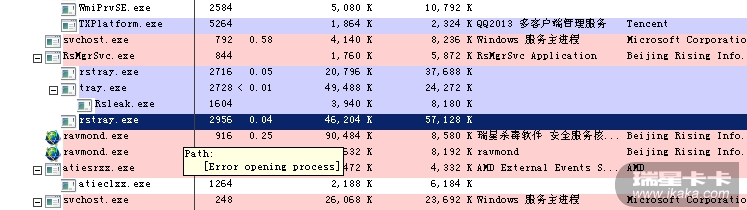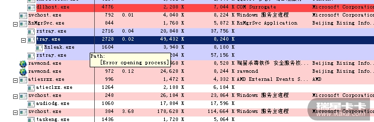 如图,有进程,无托盘。进程路径显示错误path:error opening process。
