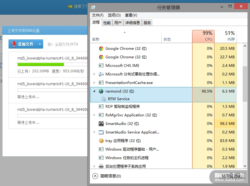 问题场景:使用Chrome浏览器使用360云盘网页版(已安装360的大文件上传插件),单个文件500MB没什么问题,当我添加了几十个500MB的文件到列表之后,CPU占用猛增至95%+,很恐怖,通过浏览器上传个文件有啥好警惕的,这么高的CPU受不了。