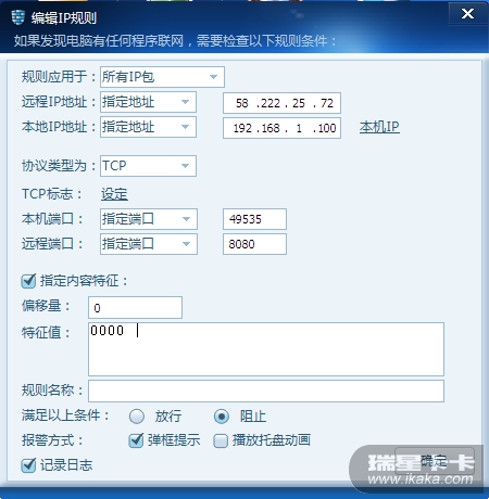 在网上看到瑞星防火墙可以过滤某些数据包 请专家帮我看看我该怎么弄才能阻止这段报文被发送或接收 防火墙IP规则该怎么设置.