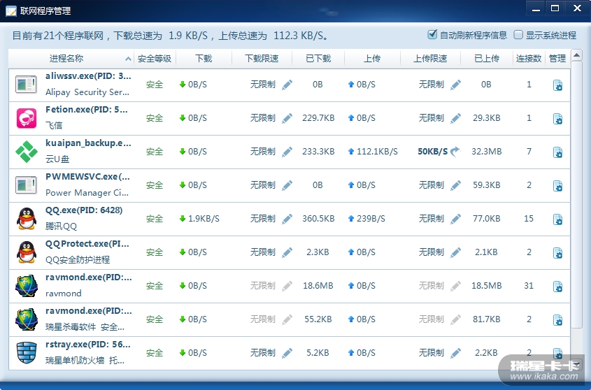 为了不影响舍友的上网,想使用瑞星防火墙的上传限速功能。但是感觉开启限速之后的效果不明显,而防火墙显示出来的速度是大于我设置的限定速度的,不知道是不是bug