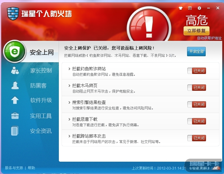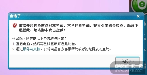 瑞星个人防火墙安全上网和黑客防护功能都不能开启!