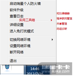 瑞星能否可以 右击右下角的防火墙图标或者杀毒软件图标,在弹出的菜单上再增加一项实用工具箱,用户可以方面地在工具箱里选择工具,不再每次要打开程序去寻找。