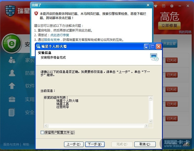 www.risng.com.cn下载最新版本安装包,重新安装一下,确定没有其他安全软件把瑞星优化了,安装瑞星的时候,相关驱动也都放过不能拦截。