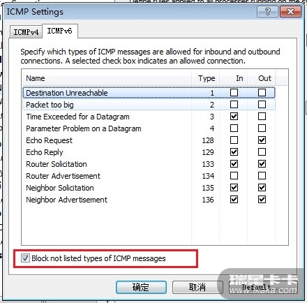 (2)在对ICMP协议的过滤方面,二者的能力基本上是相同的,但outpost更为直观,方便。二者都能够为每一种ICMP类型的数据包制定规则,差别是,瑞星将对ICMP协议过滤规则设置在了全局规则——即IP规则内,而OP将ICMP协议过滤拿到了全局规则以外,单独设置了一个ICMP协议规则,并且默认阻止除了指定选取的规则以外的数据包,此外,由于OP支持IPv6,其ICMP协议过滤也对ICMPv6协议设置了过滤规则。