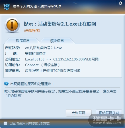 如果是未知程序的话,星墙是会自动默认拒绝联网的~上张图,楼主也可以自己试试~