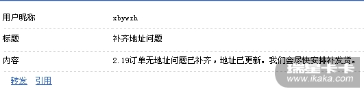 3.19已经在短消息中回复,您2.19兑换的奖品没有填写地址,所以无法邮寄,需要提交地址补齐后补发。